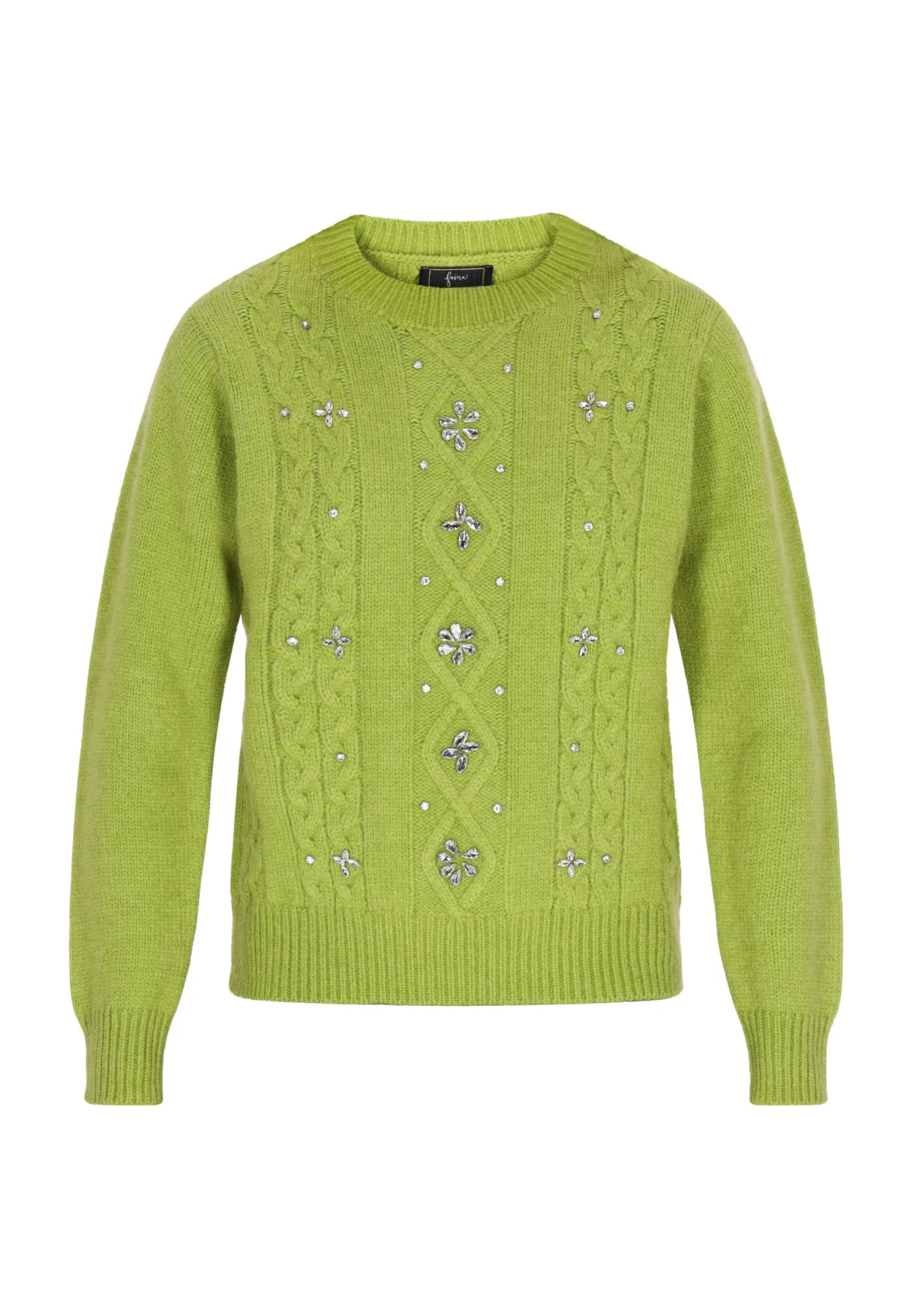 Verrijk je wintergarderobe met deze kunstig ontworpen trui. Het kabelbreisel is versierd met subtiel geborduurde bloemen en glinsterende pailletten en kralen, waardoor een unieke textuurlook ontstaat. Geribde manchetten en een geribde tailleband zorgen voor een comfortabele pasvorm, terwijl de ronde hals een vleugje elegantie toevoegt. Blijf gezellig en stijlvol in dit veelzijdige kledingstuk dat charme en elegantie uitstraalt. Jumper