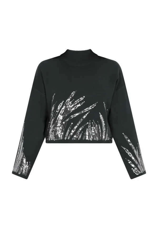 Geef je stijl een boost met deze cropped trui met hoge hals en lange mouwen. Glinsterende pailletten voegen een vleugje glamour toe. Dit stuk zorgt voor comfort en warmte. Jumper