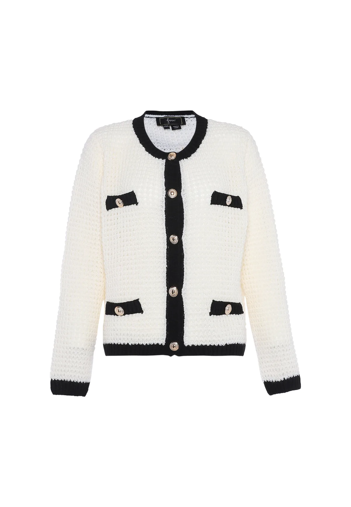 Dit gebreide vest is gemaakt met nauwgezette aandacht voor detail en heeft een intrigerend structuurpatroon. De ronde halslijn en de opening aan de voorkant, beveiligd met een reeks knopen, stralen tijdloze elegantie uit. Geribde details aan de halslijn, zoom en manchetten zorgen voor een vleugje verfijning. Gebreid jasje