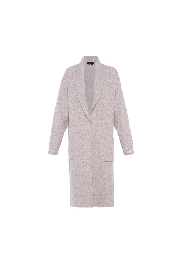 Deze knielange jas is een verfijnde toevoeging aan je garderobe en heeft een structuurstof en een reverskraag voor een elegante touch. Met zijn losse, iets oversized silhouet biedt dit open ontwerp zowel comfort als stijl. Met twee zakken op heuphoogte en strakke lijnen aan de zoom, manchetten en opening aan de voorkant straalt deze jas een gestructureerde maar vloeiende elegantie uit. Ideaal voor wie op zoek is naar een chique en casual look met een vleugje verfijning. Vest trui