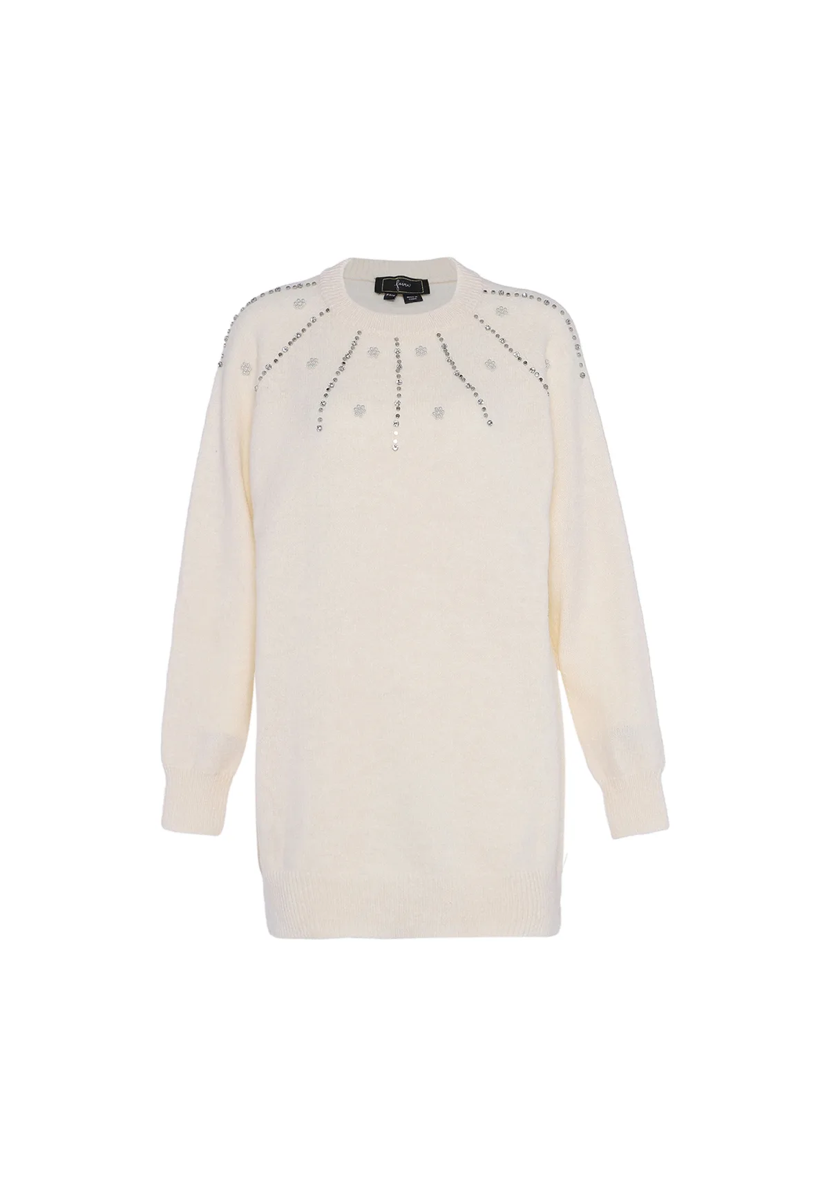 Deze trui met lange mouwen is gemaakt voor de modebewuste persoon en heeft een ronde halslijn met geribde manchetten en zoom voor een vleugje verfijning. Versierd met een ingewikkeld patroon van kleine, ronde versieringen in een symmetrisch ontwerp over de borst, straalt dit kledingstuk elegantie uit. De losse pasvorm zorgt voor comfort, terwijl de sluiting aan de achterkant een uniek tintje toevoegt aan dit stijlvolle kledingstuk. Pullover trui