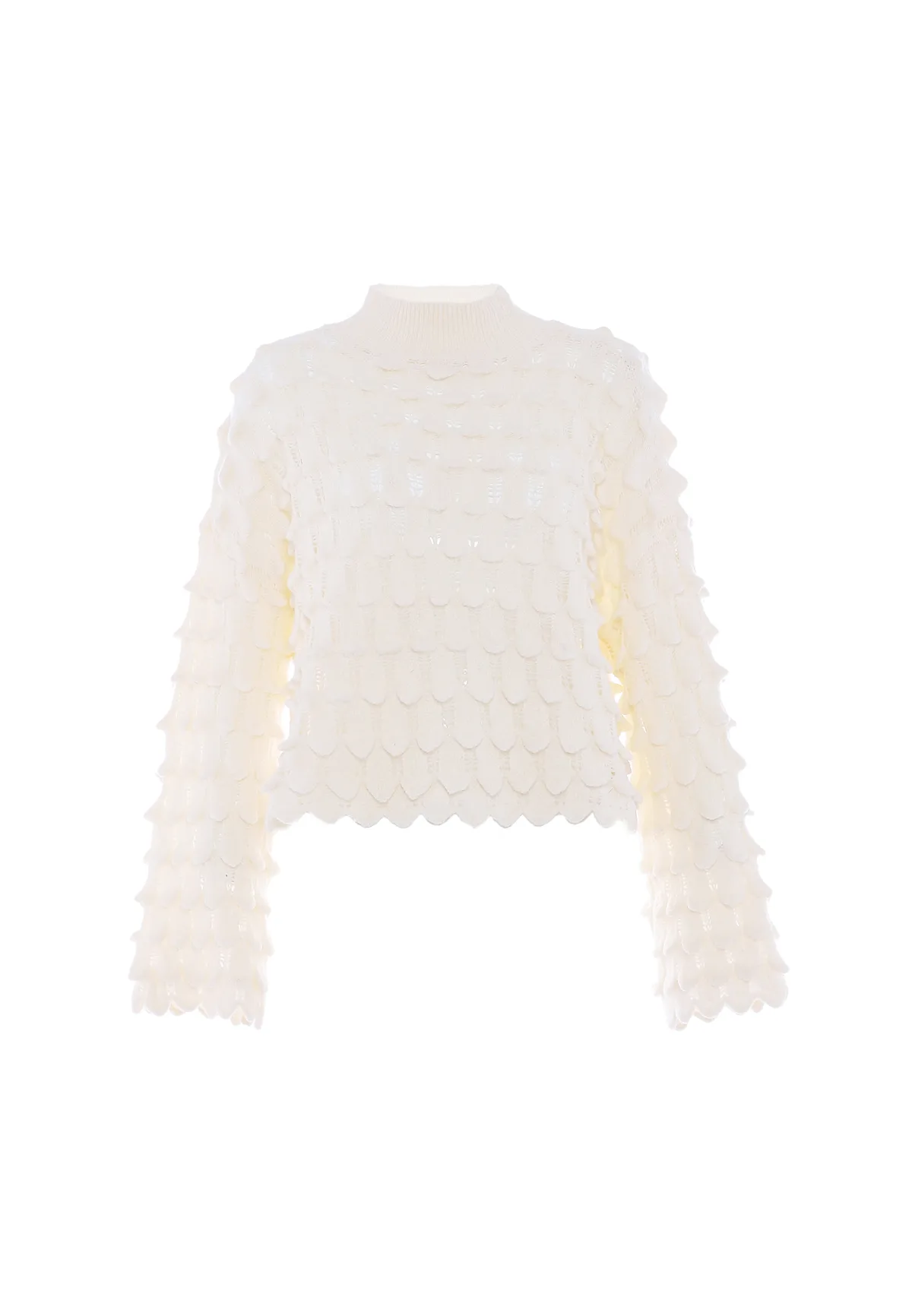 Deze gebreide trui is met precisie vervaardigd en heeft een uniek patroon dat een betoverend semi-transparant effect creëert. Met een chique hoge halslijn en elegante lange mouwen die uitlopen in klokvormen bij de polsen. De golvende zoom en mouwranden geven dit prachtige kledingstuk een charmante toets. Pullover trui