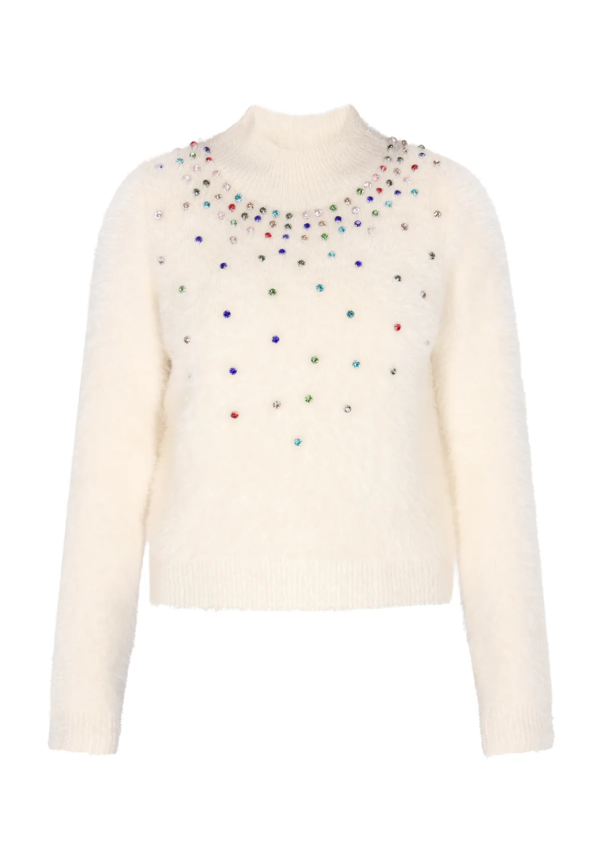 Ontdek deze stijlvolle trui met lange mouwen en ingewikkelde versieringen op de borst en halslijn voor een verfijnde touch. Het hoge halsontwerp en de lange mouwen zorgen voor warmte, terwijl de geribde halslijn, manchetten en zoom zorgen voor een goede pasvorm. Dit stuk combineert comfort en chique elegantie. Jumper