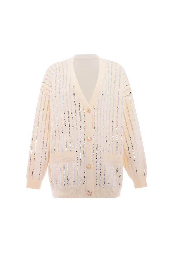 Hier is een chique gebreid vest met een elegante V-hals en een knoopsluiting. Dit kledingstuk heeft lange mouwen met geribde manchetten en zoom voor extra textuur. Versierd met verticale lijnen van pailletten of kralen, straalt het een glamoureuze charme uit. De grote decoratieve knopen aan de voorkant voegen een extra vleugje elegantie toe aan deze loszittende buitenlaag, perfect voor elke gelegenheid. Gebreid jasje