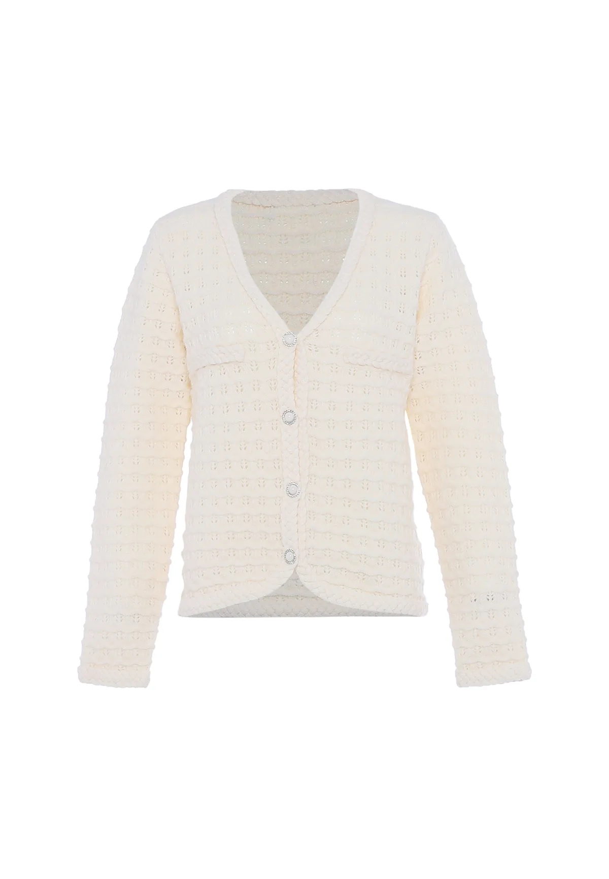 Dompel jezelf onder in de allure van dit gebreide vest dat indruk maakt met een intrigerend structuurpatroon en een charmante V-hals. Versierd met ronde, glanzende knopen langs de opening aan de voorkant, straalt dit kledingstuk elegantie uit. De lange mouwen zijn voorzien van geribde manchetten en zoom voor extra verfijning. Gebreid jasje