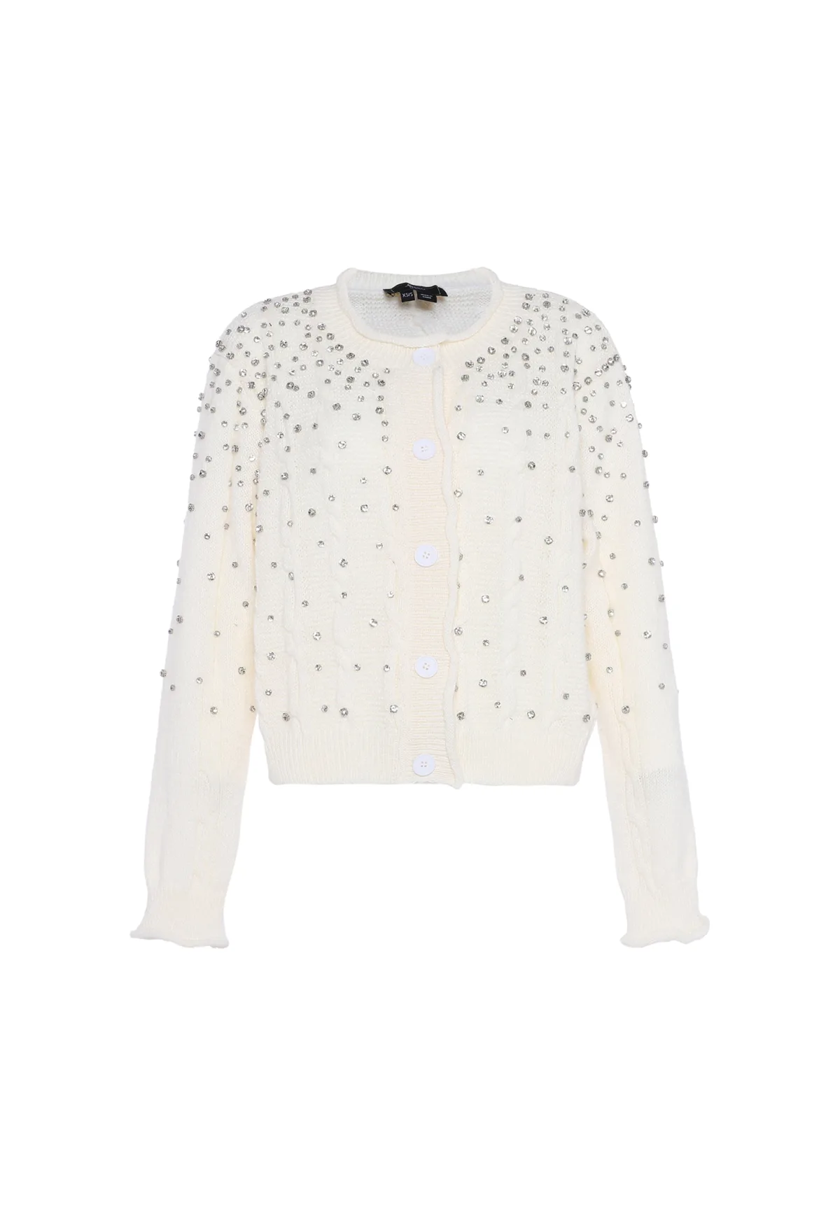 Dit gebreide vest heeft een klassieke ronde hals en lange mouwen, aangevuld met een knoopsluiting aan de voorkant. Versierd met kleine reflecterende accenten aan de voor- en achterkant, waardoor een opvallend patroon ontstaat dat geleidelijk vervaagt richting de zoom. De geribde manchetten en zoom voegen structuur toe aan dit nauwsluitende silhouet, perfect om over je outfit te dragen voor extra stijl en warmte. Gebreid jasje