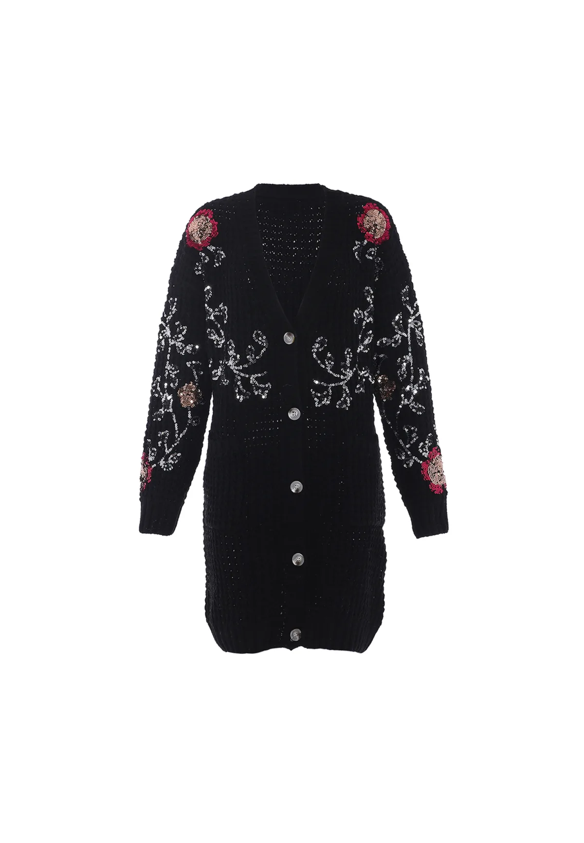 Dit prachtig vervaardigde vest heeft een verfijnde V-hals en knoopsluiting, versierd met ingewikkelde bloemenborduursels en glinsterende pailletten voor een elegante touch. De geribde zoom, manchetten en opening aan de voorkant zorgen voor een nauwe maar comfortabele pasvorm bij de polsen en taille. Met zijn relaxte silhouet en veelzijdige ontwerp is dit vest perfect om over je favoriete outfits te dragen. Gebreid jasje