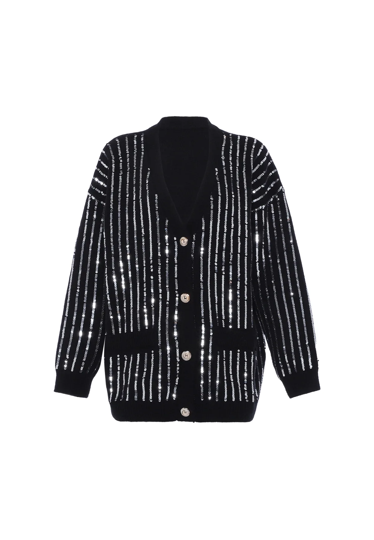 Hier is een chique gebreid vest met een elegante V-hals en een knoopsluiting. Dit kledingstuk heeft lange mouwen met geribde manchetten en zoom voor extra textuur. Versierd met verticale lijnen van pailletten of kralen, straalt het een glamoureuze charme uit. De grote decoratieve knopen aan de voorkant voegen een extra vleugje elegantie toe aan deze loszittende buitenlaag, perfect voor elke gelegenheid. Gebreid jasje