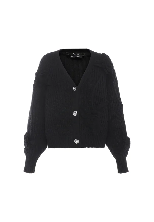 Geef je garderobe een boost met dit prachtige gebreide vest. Het heeft een V-hals en een knoopsluiting en maakt indruk met uitgebreide kabelpatronen met bloemen- of rozetdessins aan de voorkant. De lange mouwen hebben geribde manchetten, terwijl de glanzende knopen een vleugje elegantie toevoegen. Met een losse pasvorm en iets kortere lengte is dit vest perfect om textuur aan je outfit toe te voegen. Gebreid jasje