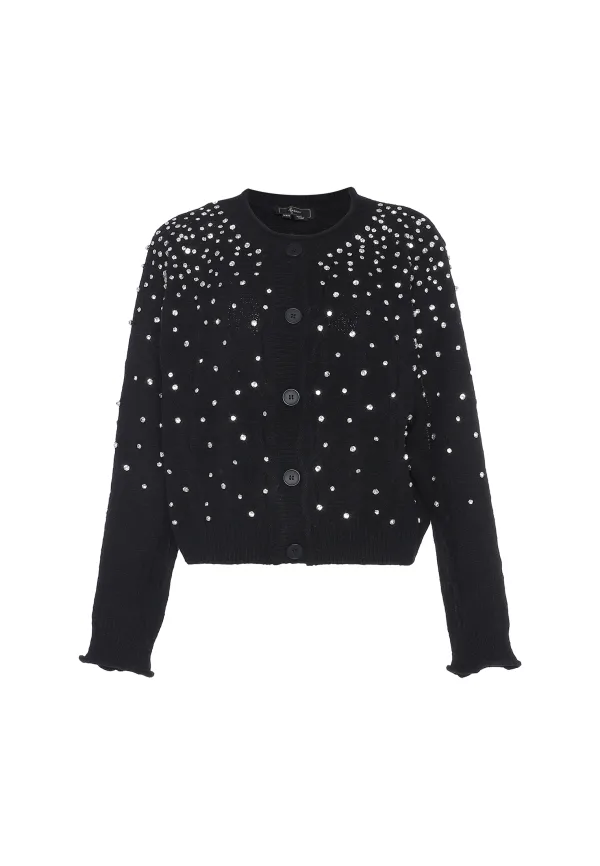 Dit gebreide vest heeft een klassieke ronde hals en lange mouwen, aangevuld met een knoopsluiting aan de voorkant. Versierd met kleine reflecterende accenten aan de voor- en achterkant, waardoor een opvallend patroon ontstaat dat geleidelijk vervaagt richting de zoom. De geribde manchetten en zoom voegen structuur toe aan dit nauwsluitende silhouet, perfect om over je outfit te dragen voor extra stijl en warmte. Gebreid jasje