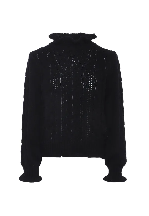 Bijzonder mooi bij deze kabeltrui: de opstaande kraag, tailleband en manchetten zijn afgewerkt met romantische ruches. De lange mouwen en zoom zijn voorzien van elastische, geribde manchetten. Pullover trui