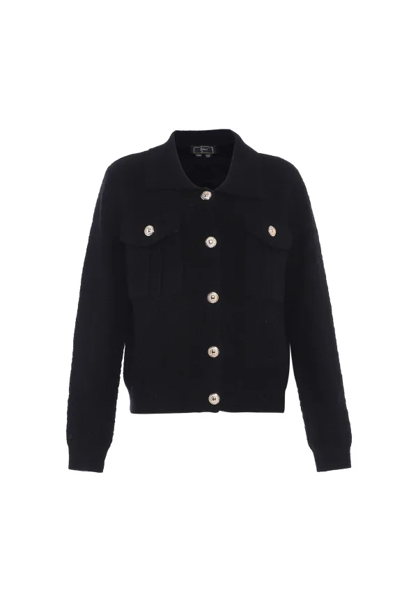 Ontdek een veelzijdig gebreid vest met kraag en knoopsluiting voor een moeiteloze stijl. Dit kledingstuk heeft een geribbelde textuur, lange mouwen en aansluitende lengte en biedt een casual en toch verfijnde look. Compleet met twee borstzakken met klepsluiting en opvallende decoratieve knopen, straalt hij zowel functionaliteit als charme uit. De zachte, dikke stof zorgt voor warmte, terwijl de normale tot iets losse pasvorm zorgt voor comfort bij verschillende gelegenheden. Gebreid jasje