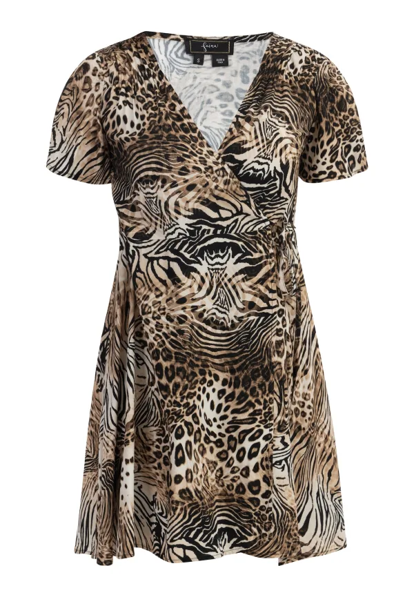 Deze faina-creatie staat voor pure glamour. Het is in Italië gemaakt van zachte, soepele viscose in een cropped stijl en heeft een lijfje met wikkeleffect. De exotische dierenprint en korte mouwen zijn afgewerkt met een elastische taille, die nog eens geaccentueerd wordt door een strikceintuur. Draag de elegante zomerjurk met je favoriete pumps of avondhoge hakken. Midi-jurk met korte mouwen