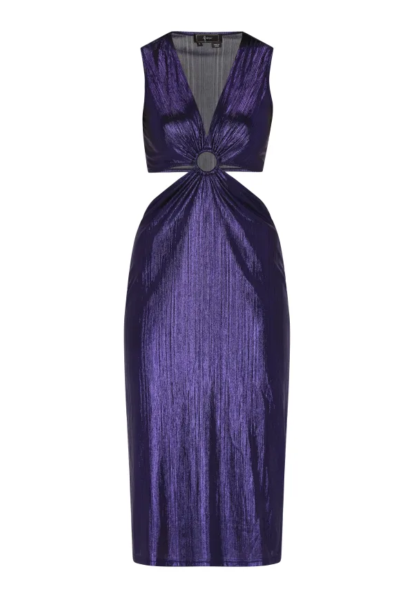 Deze jurk is gemaakt voor verfijnde gelegenheden en heeft een mouwloos ontwerp met een flatterende V-hals. De stof heeft een glanzende metallic glans en een gestructureerd oppervlak dat een fascinerend kreukeffect creëert. De aansluitende taille trekt de aandacht met een geplooid detail dat uitstraalt vanuit een centrale cirkelvormige versiering. Jurk