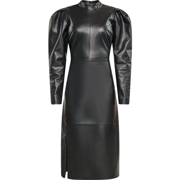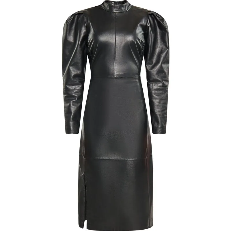 Geef je garderobe een boost met deze leren midi-jurk met een getailleerd silhouet en hoge halslijn. De lange pofmouwen voegen een vleugje vrouwelijkheid toe, terwijl het gestructureerde ontwerp elegantie uitstraalt. Dit strakke en gepolijste exemplaar is perfect voor formele gelegenheden en is een must-have in elke modieuze collectie. Dit product maakt deel uit van de Soft Lamb Leather Collection Jurk