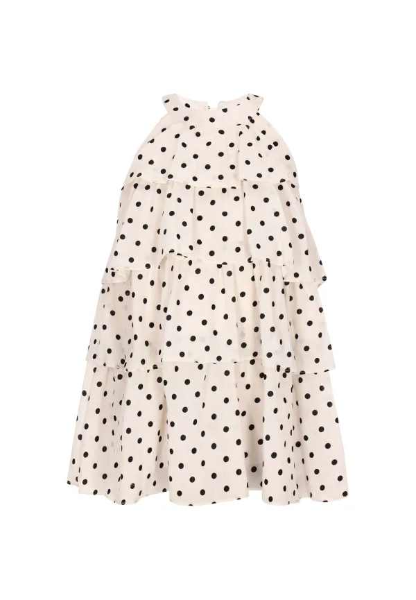Design: Gevoerde zoom/rand; Type sluiting: Knoopsluiting; Materiaal: Chiffon; Halstype: Ronde hals; Motief: Gestippeld; Soort bandjes: Haltermodel; Details: Cut-outs, Volant; Extra's: All-over patroon; Lengte: Kort/mini; Snit: Uitlopend; Pasvorm: Losse pasvorm; Armlengte: Mouwloos