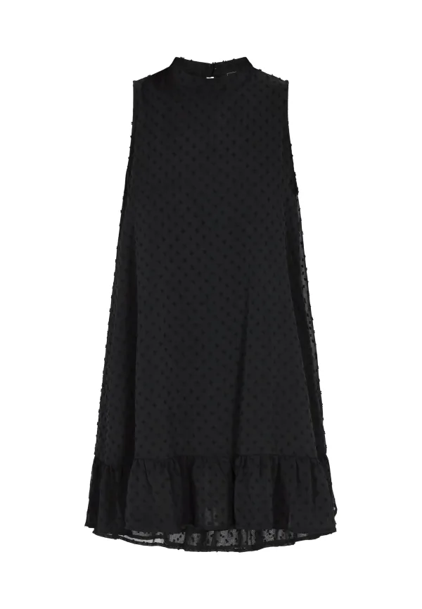 Design: Keyholesluiting; Type sluiting: Knoopsluiting; Materiaal: Chiffon; Halstype: Opstaande kraag; Motief: Effen; Soort bandjes: Brede bandjes; Details: Cut-outs, Volant; Extra’s: Op staal naden; Lengte: Kort/mini; Snit: Uitlopend; Pasvorm: Losse pasvorm; Armlengte: Mouwloos