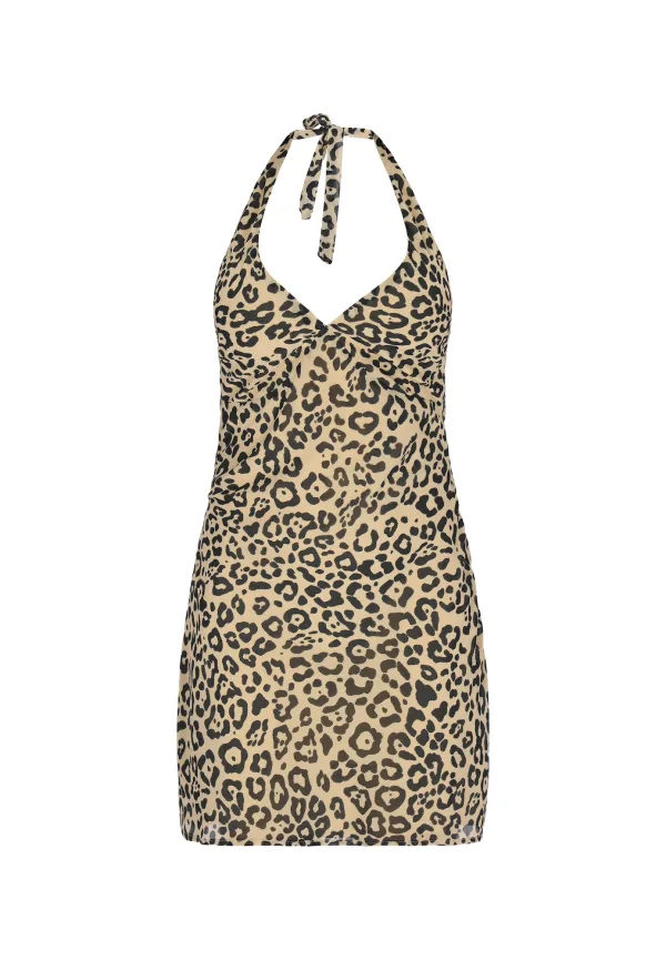 Design: Diepe snit/decolleté, Om te knopen/binden; Type sluiting: Ritssluiting; Halstype: V-hals; Motief: Dierenprint; Soort bandjes: Haltermodel; Details: Backless; Extra's: All-over patroon; Lengte: Kort/mini; Snit: Figuur omarmend; Pasvorm: Aansluitende pasvorm; Armlengte: Mouwloos