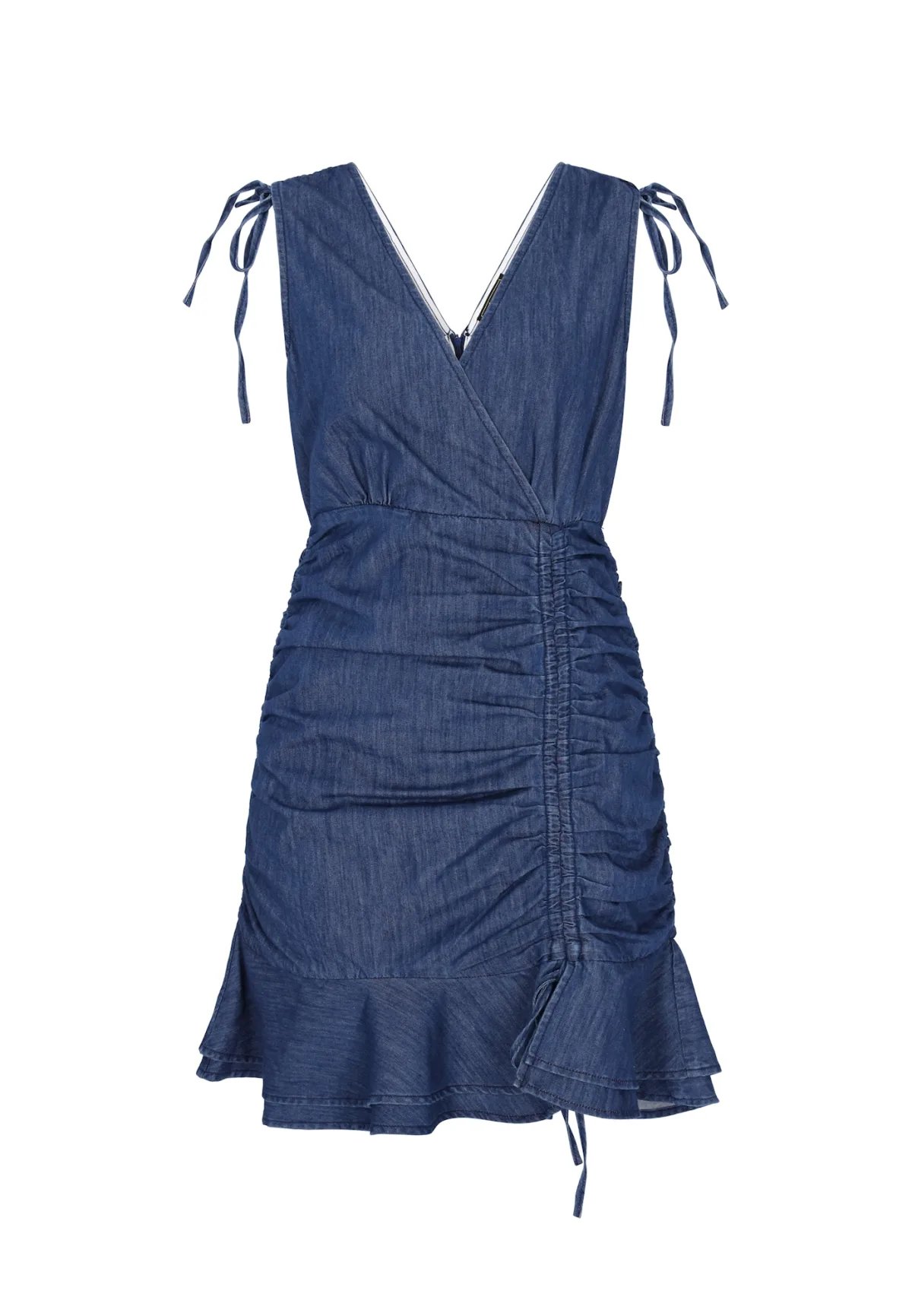 Design: Om te knopen/binden; Type sluiting: Ritssluiting; Materiaal: Denim; Halstype: Wikkeltop; Motief: Effen; Soort bandjes: Brede bandjes; Details: Volant, Gedrapeerd; Extra's: Vaste grip; Lengte: Kort/mini; Snit: Getailleerd; Pasvorm: Slanke pasvorm; Armlengte: Mouwloos