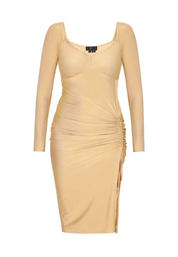 Design: Gevoerde zoom/rand; Motief: Effen; Details: Gedrapeerd; Extra's: Gladde stof; Lengte: Knielengte; Snit: Figuur omarmend; Pasvorm: Aansluitende pasvorm; Armlengte: Lange mouw