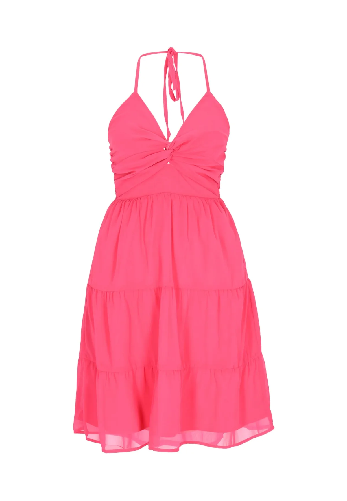 Design: Om te knopen/binden; Type sluiting: Slip; Materiaal: Chiffon; Halstype: V-hals; Motief: Effen; Soort bandjes: Haltermodel; Details: Volant, Gedrapeerd, Backless; Extra's: Op staal naden; Lengte: Kort/mini; Snit: Getailleerd; Pasvorm: Normale pasvorm; Armlengte: Mouwloos