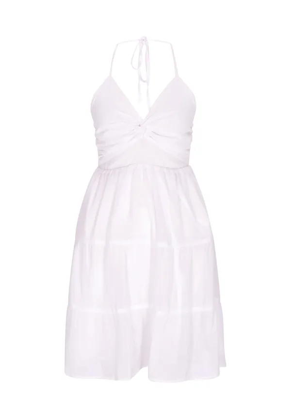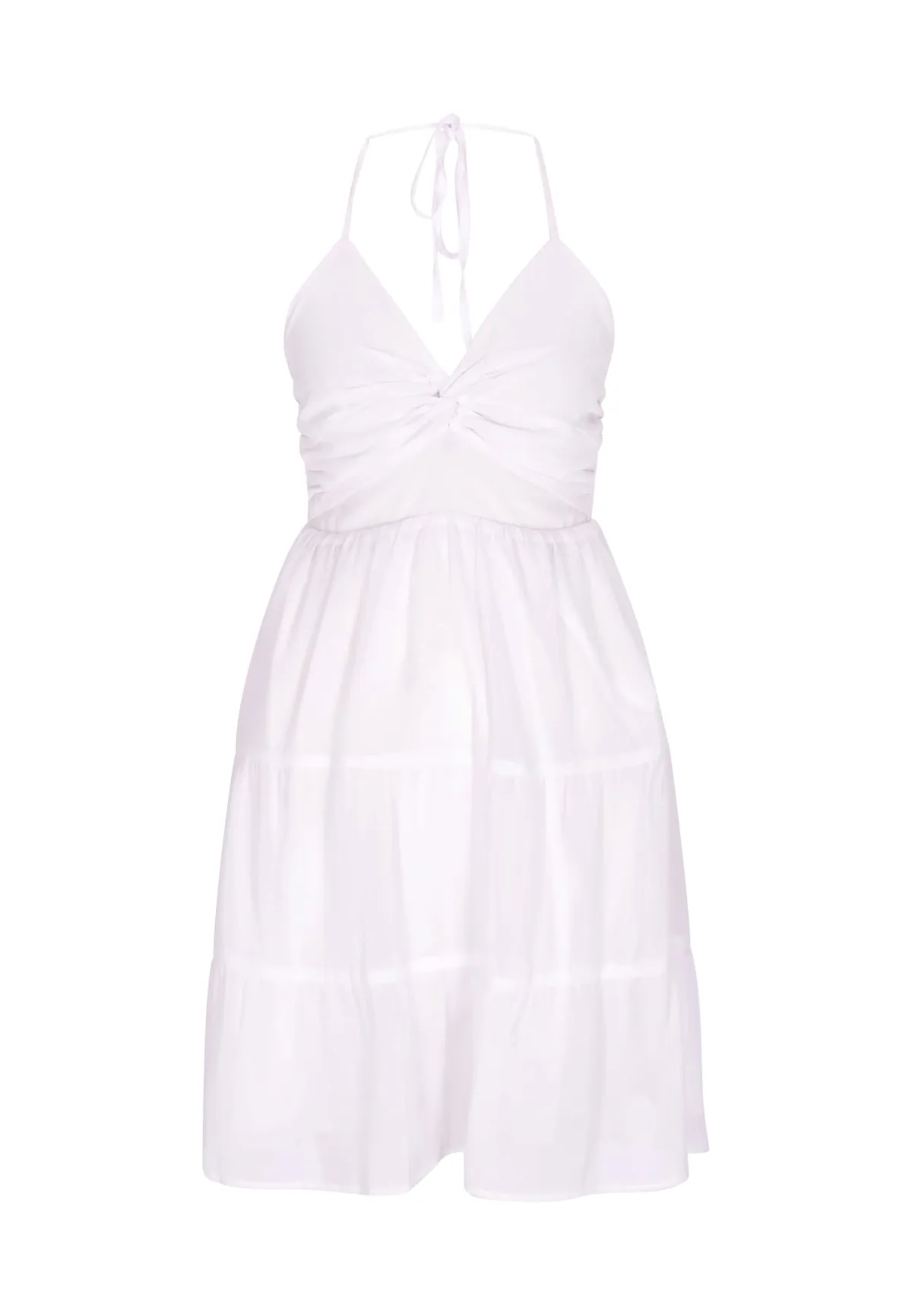 Design: Om te knopen/binden; Type sluiting: Slip; Materiaal: Chiffon; Halstype: V-hals; Motief: Effen; Soort bandjes: Haltermodel; Details: Volant, Gedrapeerd, Backless; Extra's: Op staal naden; Lengte: Kort/mini; Snit: Getailleerd; Pasvorm: Normale pasvorm; Armlengte: Mouwloos