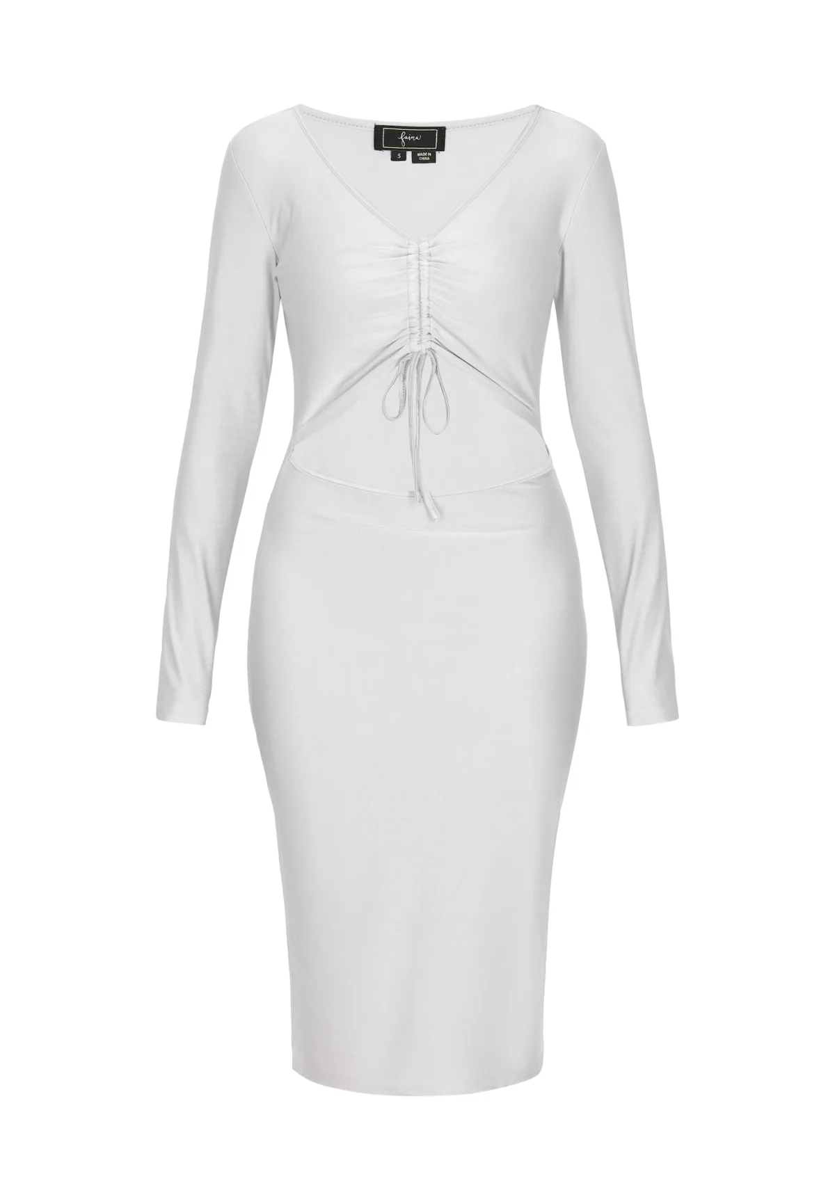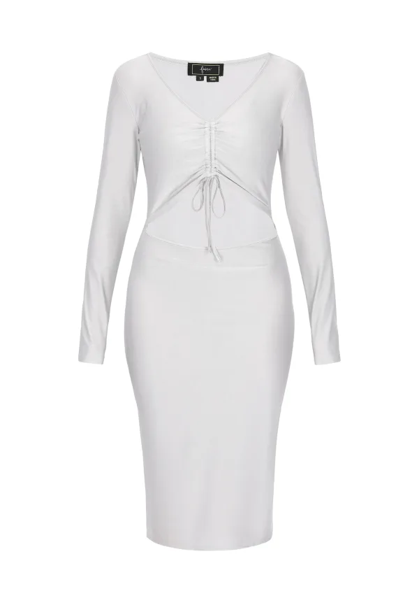 Design: Om te knopen/binden; Materiaal: Jersey; Halstype: V-hals; Motief: Effen; Details: Cut-outs, Gedrapeerd; Extra's: Glinsterend; Lengte: Knielengte; Snit: Figuur omarmend; Pasvorm: Aansluitende pasvorm; Armlengte: Lange mouw