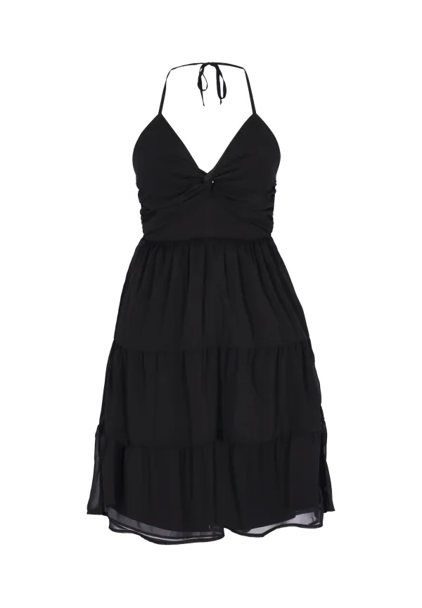Design: Gevoerde zoom/rand, Om te knopen/binden; Type sluiting: Slip; Materiaal: Chiffon; Halstype: V-hals; Motief: Effen; Soort bandjes: Haltermodel; Details: Volant, Gedrapeerd, Backless; Extra's: Op staal naden, Lichte stof; Lengte: Kort/mini; Snit: Getailleerd; Pasvorm: Normale pasvorm; Armlengte: Mouwloos