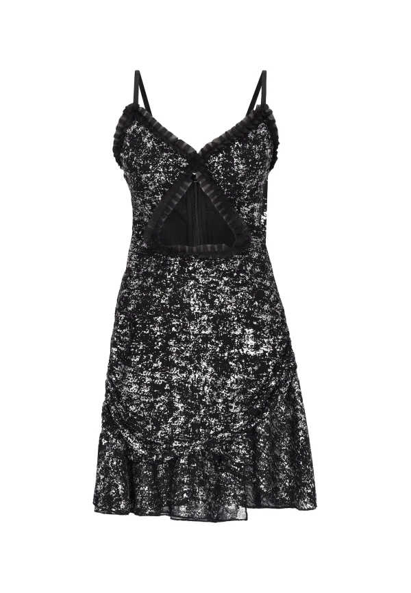 Design: Gevoerde zoom/rand, Rug rits; Type sluiting: Ritssluiting; Halstype: V-hals; Soort bandjes: Spaghettibandjes; Details: Cut-outs, Ruches, Volant, Gedrapeerd; Extra's: Verstelbare bandjes, All-over patroon; Lengte: Kort/mini; Snit: Getailleerd; Pasvorm: Slanke pasvorm; Armlengte: Mouwloos