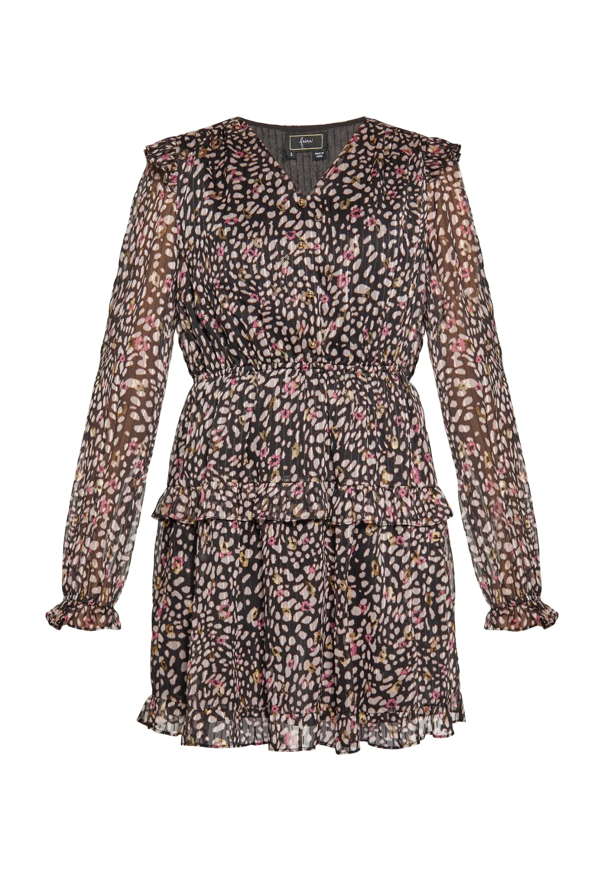 Laat je wilde kant los met deze mini-jurk met dierenprint, romantische ruches en een fladderende V-hals. De gelaagde snit met ruches straalt vrouwelijkheid uit, terwijl de slanke taille een aansluitend silhouet creëert. Dankzij de lange mouwen is de jurk geschikt voor koudere dagen. Deze mini-jurk is ideaal voor casual en semi-formele gelegenheden en zal overal de aandacht trekken. Dit product maakt deel uit van de Animal Pattern Collection Jurk