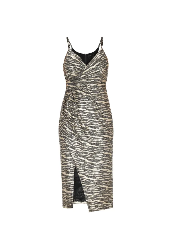 Design: Beenopening, Verstelbare riemen; Type sluiting: Ritssluiting; Halstype: V-hals; Motief: Dierenprint; Soort bandjes: Spaghettibandjes; Details: Pailletten, Gedrapeerd; Extra's: All-over patroon, Met textuur; Lengte: Knielengte; Snit: Figuur omarmend; Pasvorm: Slanke pasvorm; Armlengte: Mouwloos