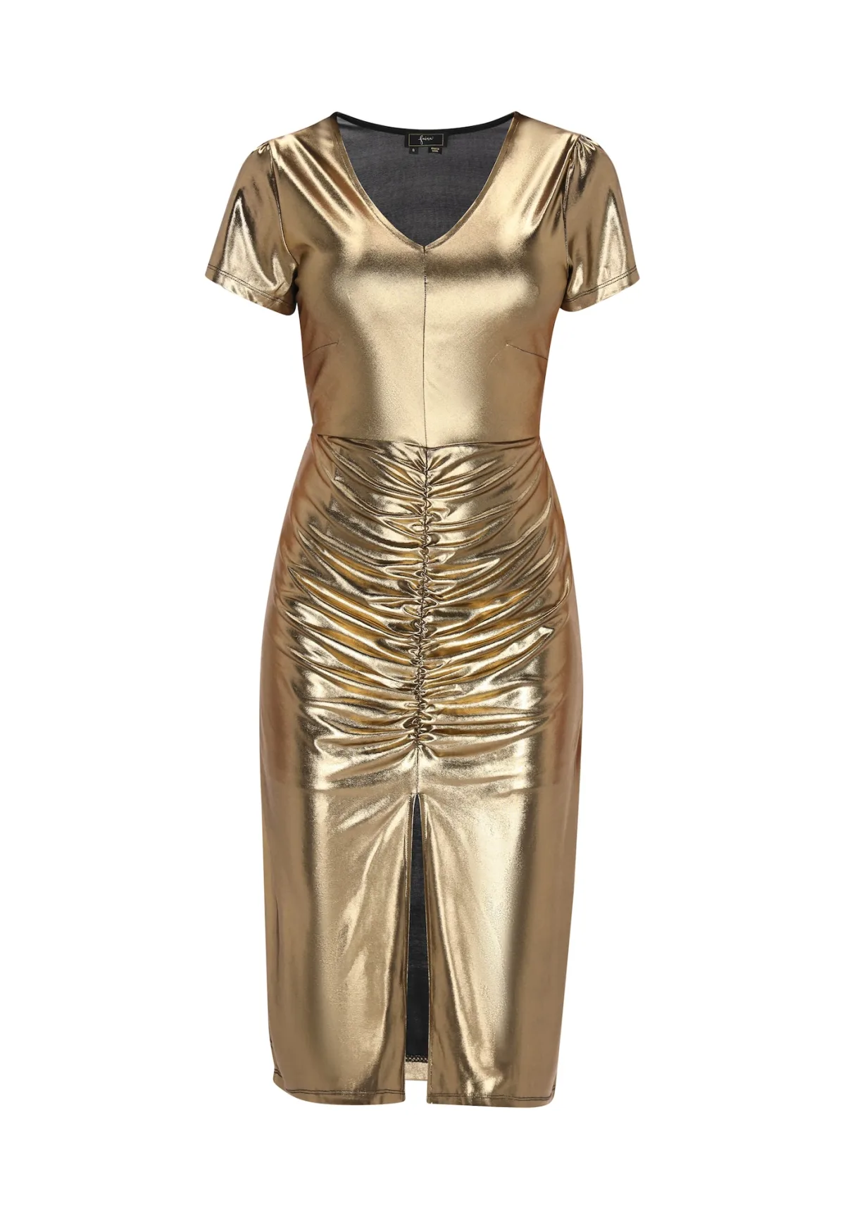 Design: Beenopening, Figuurnaden; Halstype: V-hals; Motief: Effen; Details: Gedrapeerd; Extra's: Glinsterend; Lengte: Knielengte; Snit: Figuur omarmend; Pasvorm: Aansluitende pasvorm; Armlengte: Kwartmouw