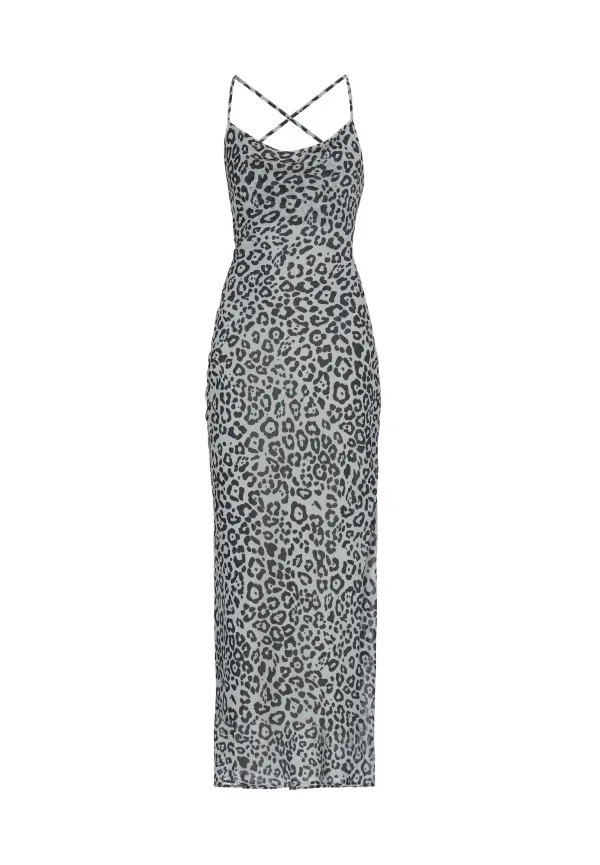Design: Beenopening; Type sluiting: Ritssluiting; Materiaal: Katoen; Halstype: Watervalhals; Motief: Dierenprint; Soort bandjes: Spaghettibandjes; Extra's: All-over patroon; Lengte: Lang/maxi; Pasvorm: Aansluitende pasvorm; Armlengte: Mouwloos