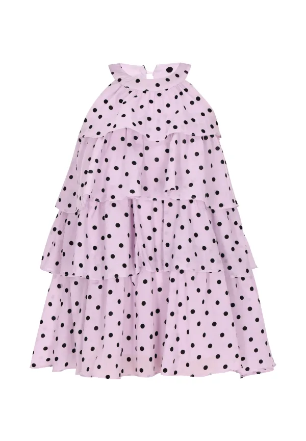 Design: Gevoerde zoom/rand; Type sluiting: Knoopsluiting; Materiaal: Chiffon; Halstype: Ronde hals; Motief: Gestippeld; Soort bandjes: Haltermodel; Details: Cut-outs, Volant; Extra's: All-over patroon; Lengte: Kort/mini; Snit: Uitlopend; Pasvorm: Losse pasvorm; Armlengte: Mouwloos