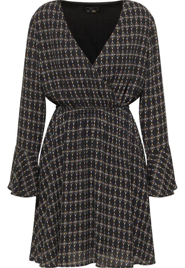 Met deze stijlvolle outfit van faina bent u verzekerd van een elegante verschijning. Het zijdeachtige, glanzende materiaal, de wikkelvormige top en de vrouwelijke V-halslijn dragen hiertoe bij, evenals de geraffineerde all-over print. De elastische tailleband draagt comfortabel en geeft volume en swing. Trendy trompetmouwen ronden deze elegante jurk af.