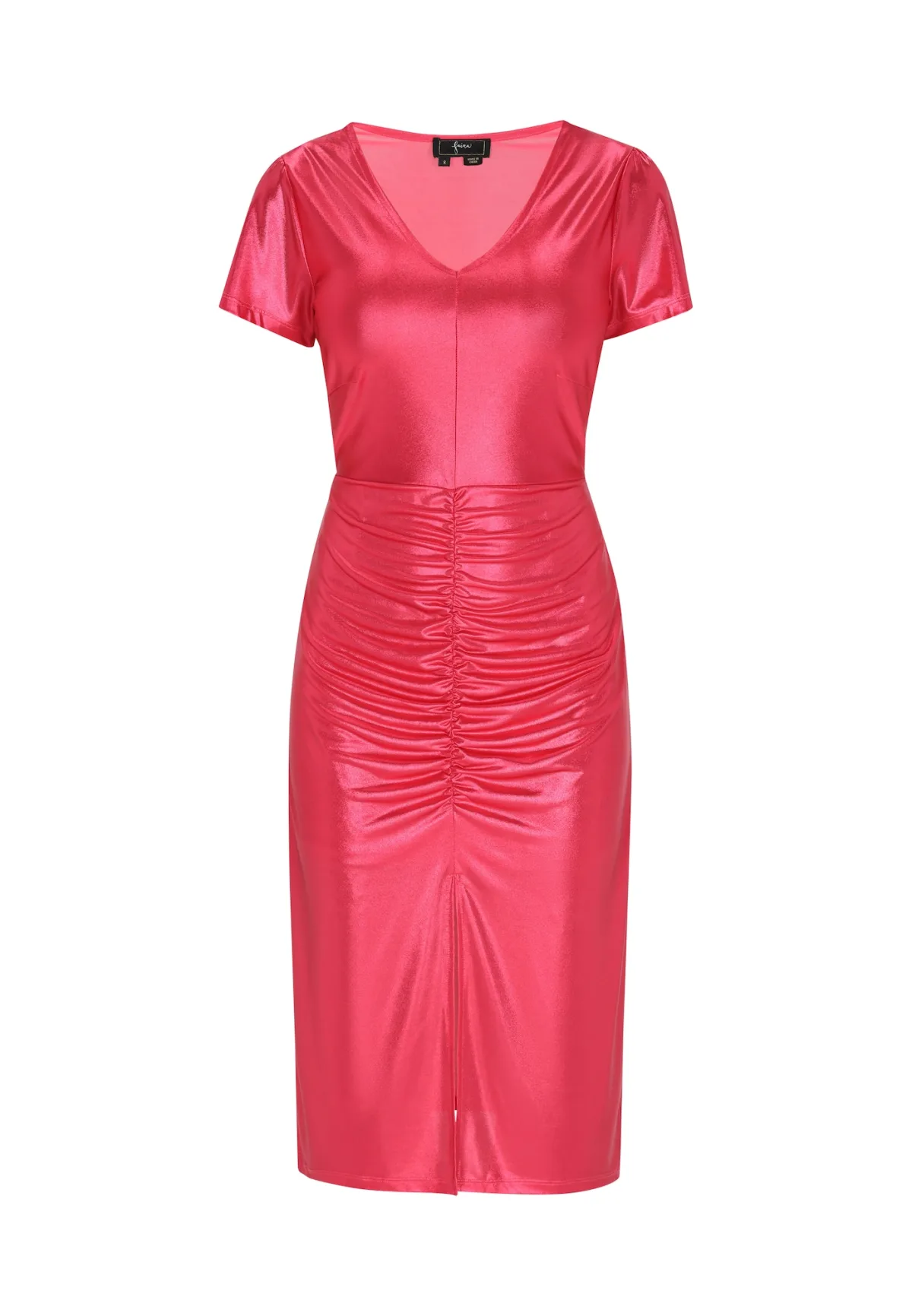 Design: Beenopening, Figuurnaden; Halstype: V-hals; Motief: Effen; Details: Gedrapeerd; Extra's: Glinsterend; Lengte: Knielengte; Snit: Figuur omarmend; Pasvorm: Aansluitende pasvorm; Armlengte: Kwartmouw