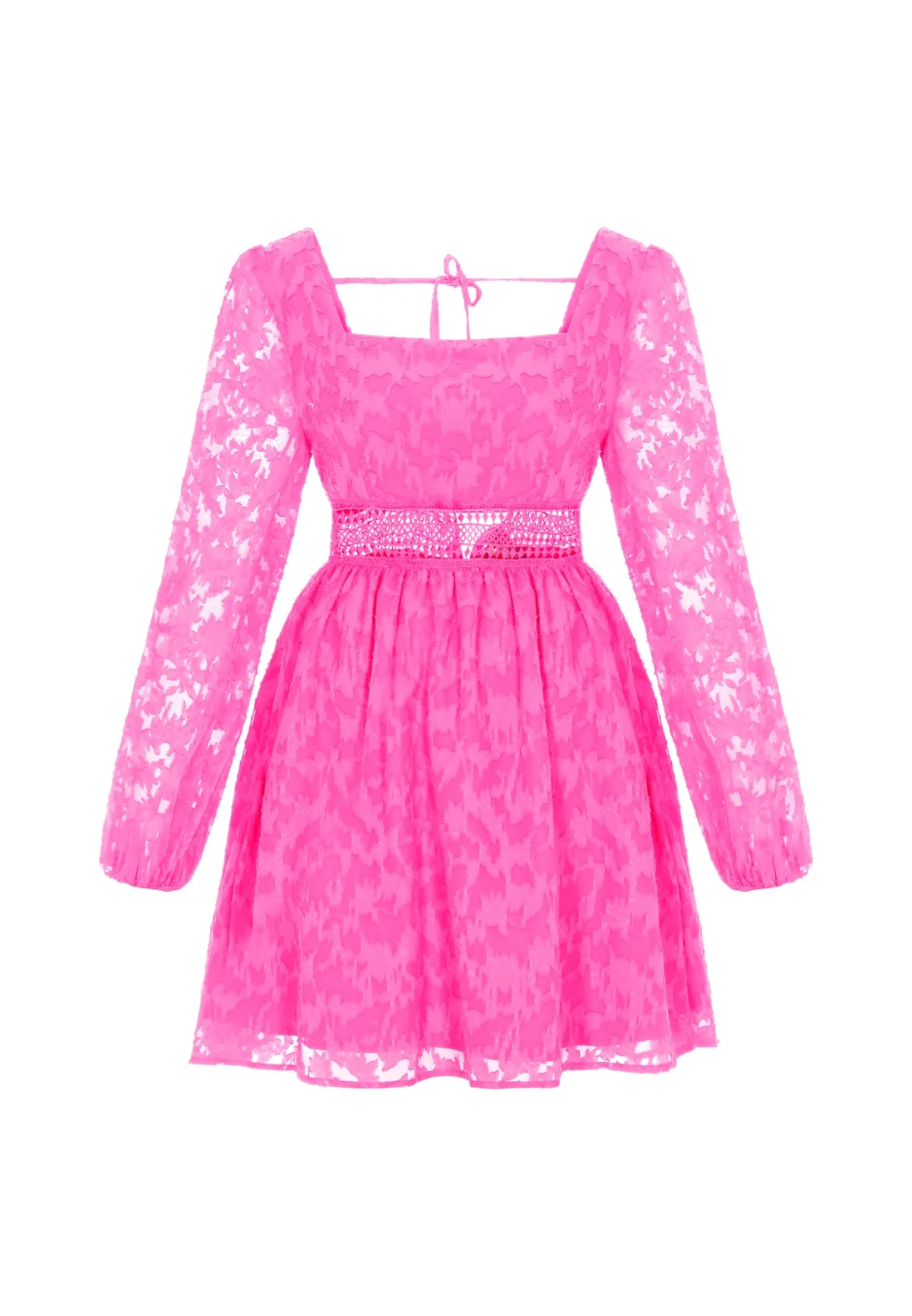 Design: Pofmouwen; Type sluiting: Ritssluiting; Halstype: Carréhals; Motief: Effen; Details: Kant, Gedrapeerd, Mesh, Backless; Extra's: Lichte stof; Lengte: Kort/mini; Snit: Getailleerd; Pasvorm: Normale pasvorm; Armlengte: Lange mouw