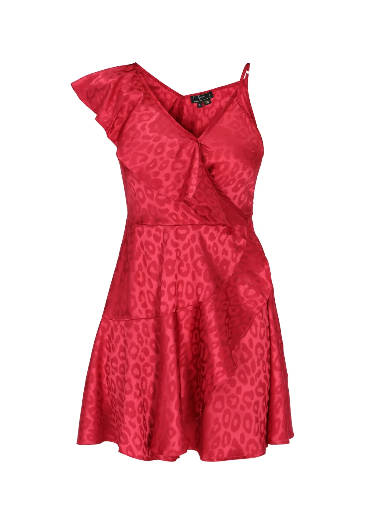 Design: Gevoerde zoom/rand, Rechte zoom; Type sluiting: Ritssluiting; Materiaal: Satijn; Halstype: V-hals; Motief: Dierenprint; Details: Ruches; Extra's: All-over patroon, Gladde stof; Lengte: Kort/mini; Snit: Getailleerd; Pasvorm: Normale pasvorm; Armlengte: Mouwloos