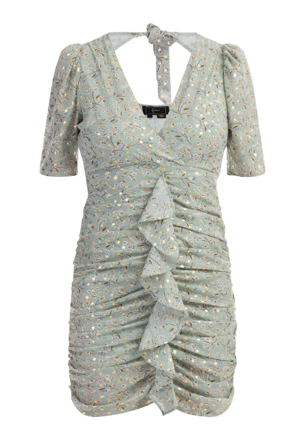 Halstype: V-hals; Motief: Bloemenprint; Details: Cut-outs, Volant, Gedrapeerd; Lengte: Kort/mini; Pasvorm: Slanke pasvorm; Armlengte: Kwartmouw