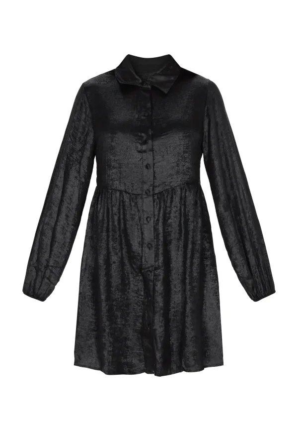 Elegante mini-jurk met een normale pasvorm. Hij heeft een stijlvolle V-hals en een klassieke kraag, en lange mouwen die bij de pols plooien voor een elegant pofeffect. Hij heeft een knoopsluiting aan de voorkant en een losse taille. Deze mini-jurk is gemaakt van zacht fluweel en maakt gegarandeerd indruk! Hij maakt deel uit van de Evening Collection. jurk
