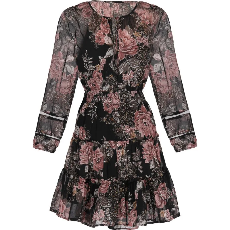De mini-jurk heeft een normale pasvorm met een gestrikte V-hals en lange mouwen met elastische manchetten. Het lichtgewicht ontwerp is voorzien van een vleugje glitter, aangevuld met een elastische tailleband voor ultiem comfort. De jurk heeft een elegant en romantisch bloemenpatroon. Hij maakt deel uit van de Fashion Look-collectie. jurk