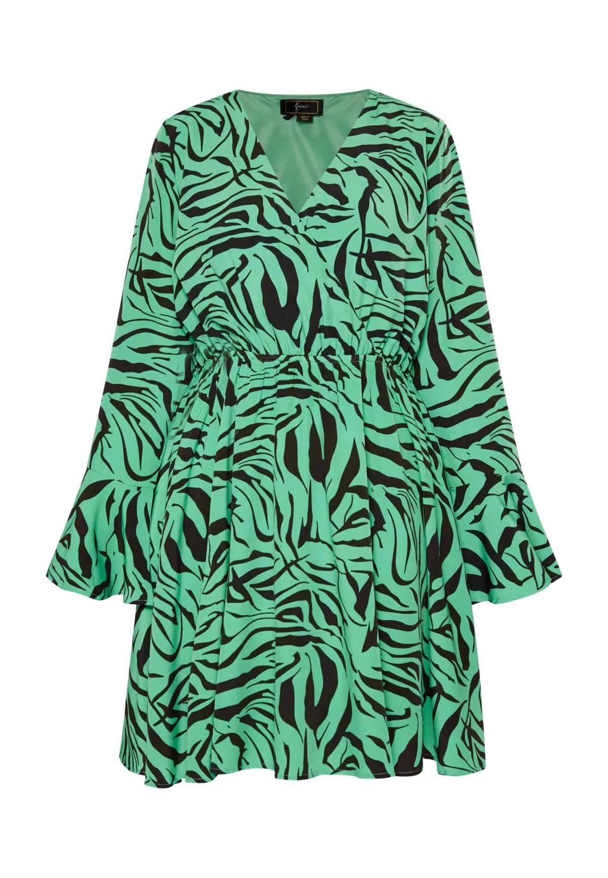 Omarm de zomer in deze midi-jurk van faina, geheel bedrukt met een zebrapatroon. Het getailleerde ontwerp heeft een sensuele wikkel-look met een V-hals en wijde trompetvormige mouwen. Een elastische tailleband benadrukt het vrouwelijke silhouet. Het zachte, kreukvrije materiaal heeft een voering aan de binnenkant die comfortabel dragen garandeert.
