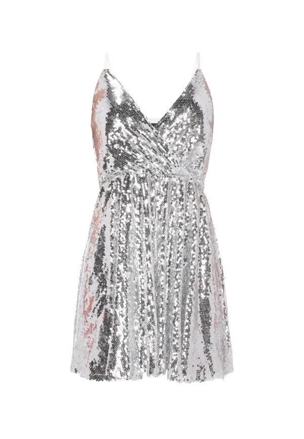 Design: Elastische taille/zoom, Wikkel-look, Uitgesneden rug; Type sluiting: Slip; Halstype: Wikkeltop; Motief: Effen; Soort bandjes: Spaghettibandjes; Details: Pailletten; Extra's: Glitterend, Verstelbare bandjes; Lengte: Kort/mini; Pasvorm: Normale pasvorm; Armlengte: Mouwloos