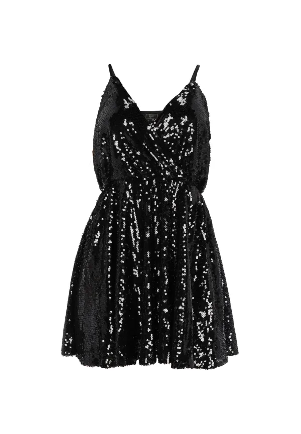 Design: Rechte zoom; Type sluiting: Slip; Halstype: Wikkeltop; Motief: Effen; Soort bandjes: Spaghettibandjes; Details: Pailletten; Extra's: Glinsterend; Lengte: Kort/mini; Pasvorm: Normale pasvorm; Armlengte: Mouwloos