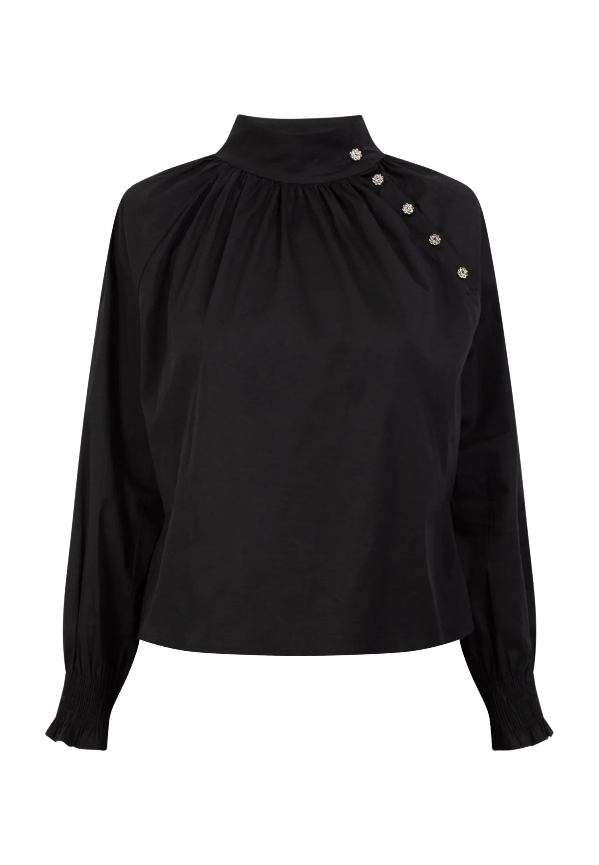 Deze Italiaanse blouse van faina is een prachtige aanvulling op uw garderobe. Met zijn kleine opstaande kraag, flatterende plooien en bloemvormige strass-knopen is het een essential die u kunt combineren met jeans, rokken of elegante stoffen broeken om op elk podium te schitteren. Het vrouwelijke ontwerp wordt afgerond door de gesmokte manchetten.