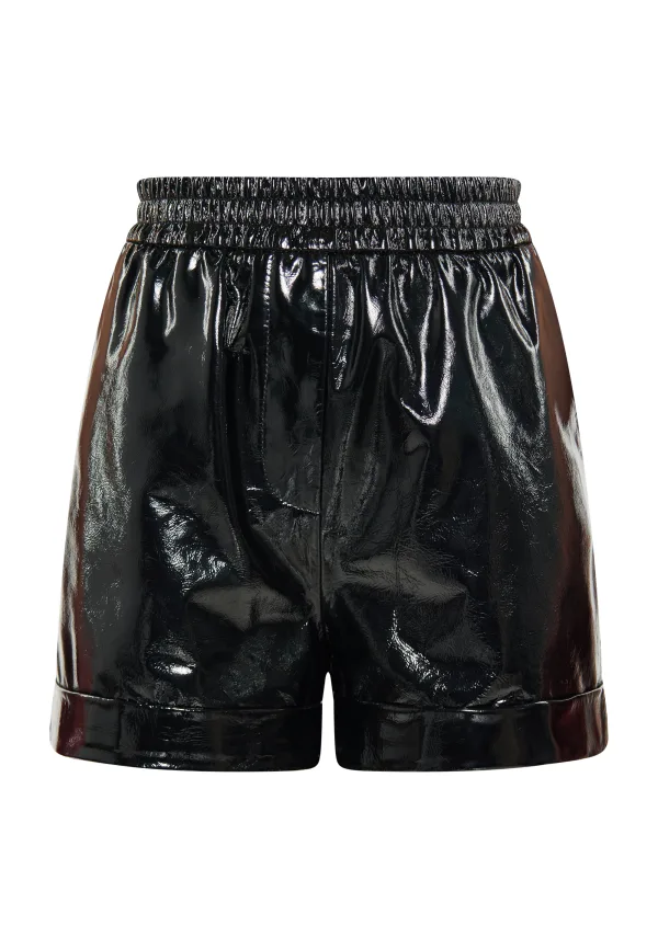 Upgrade je stijl met deze short met hoge taille die het licht opvangt. De elastische tailleband zorgt voor een flatterend plooieffect, terwijl de losse pasvorm en de zoom met manchetten een vleugje verfijning toevoegen. Deze shorts zijn perfect om een glanzende afwerking aan je look toe te voegen. Ze reflecteren het licht moeiteloos en zorgen voor een stralende uitstraling. Korte broek