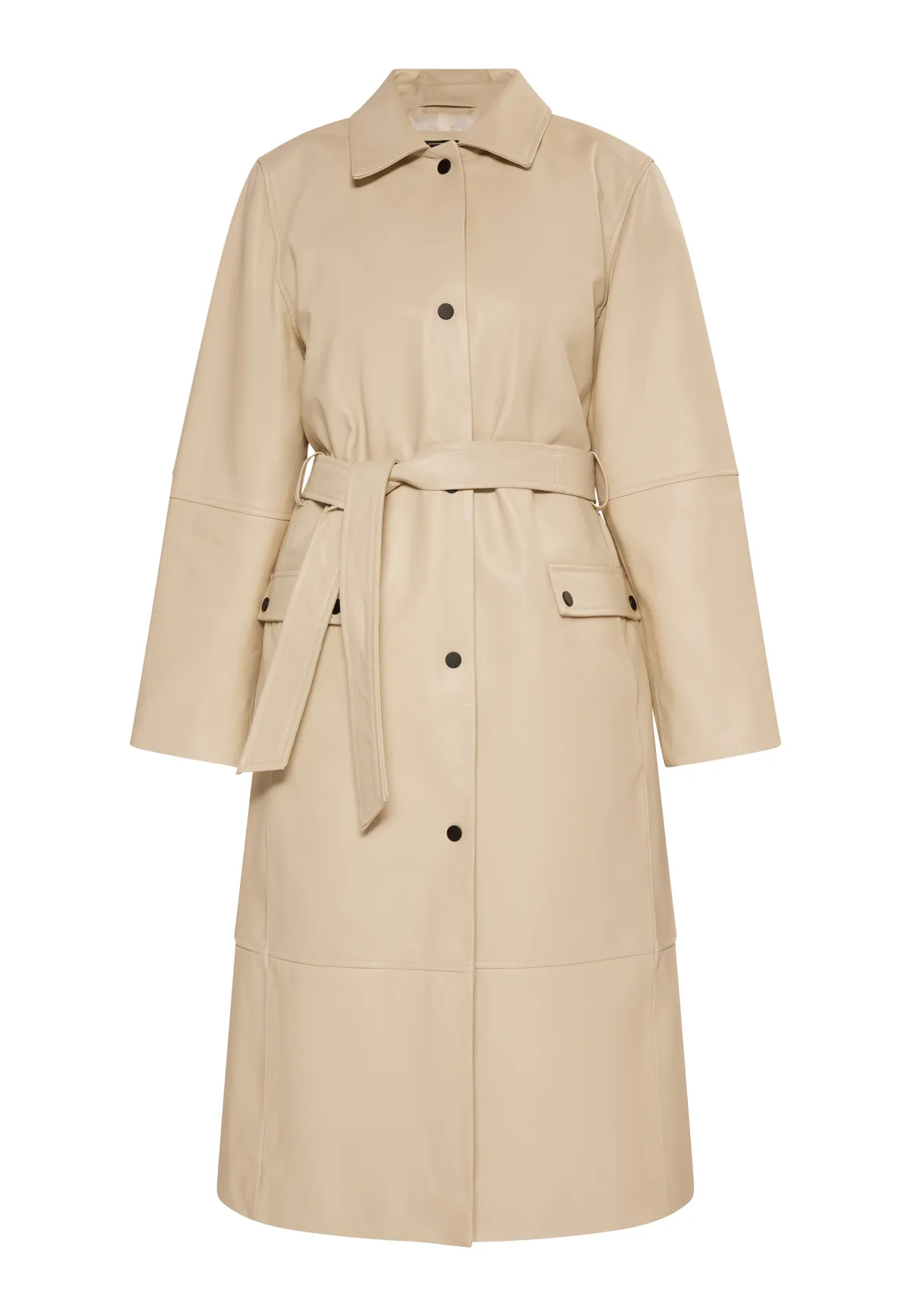 Deze tijdloze leren jas is gemaakt van boterzacht lamsleer, waardoor het een investering is die eeuwig meegaat. Het vrouwelijke model met doorlopende knoopsluiting en vouwkraag en de riem van hetzelfde materiaal die de jas tot aan de taille brengt, geven de jas een stijlvolle touch. Decoratieve naden en twee klepzakken complementeren de luxe stijl. Leren jurk