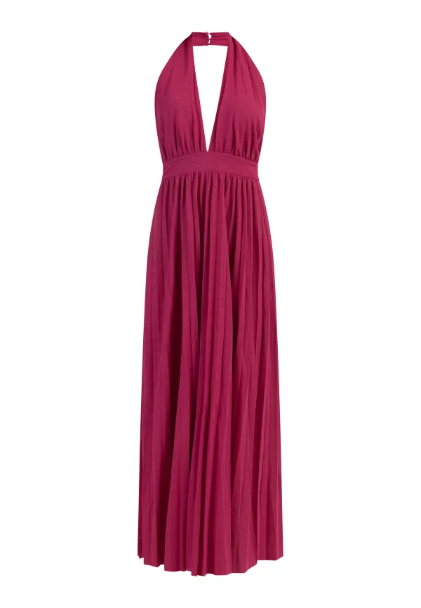 Glinsterende feestjes wachten op de glinsterende maxi-jurk van faina. De elegante jersey badjas is gemaakt in Italië en maakt indruk met een verfijnde halterhalsstijl die open of gestrikt gedragen kan worden. Een geaccentueerde taille en de wijde plooirok maken het spannende design compleet. Maxi jurk