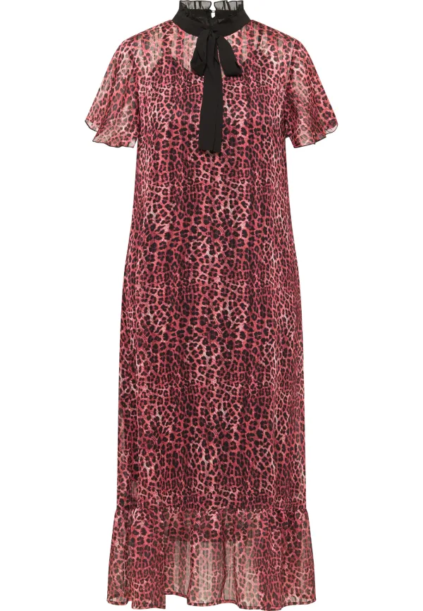 Fijne kapmouwen en een kleine opstaande kraag met ruches en strik vormen een bijzonder contrast met de midi-jurk met luipaardprint van faina. In de print zijn fijne goudkleurige draadjes geweven waardoor er een vleugje glitter ontstaat. Een ruche aan de zoom van de rok maakt dit bijzondere model compleet. Een geïntegreerde, zachte onderkleding zorgt voor een aangename dekking. Jurk maxi met korte mouwen