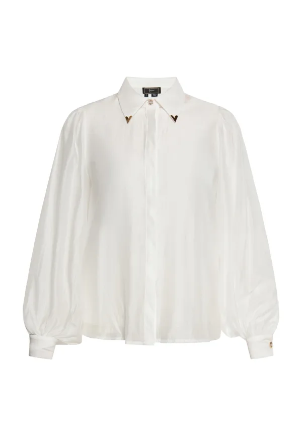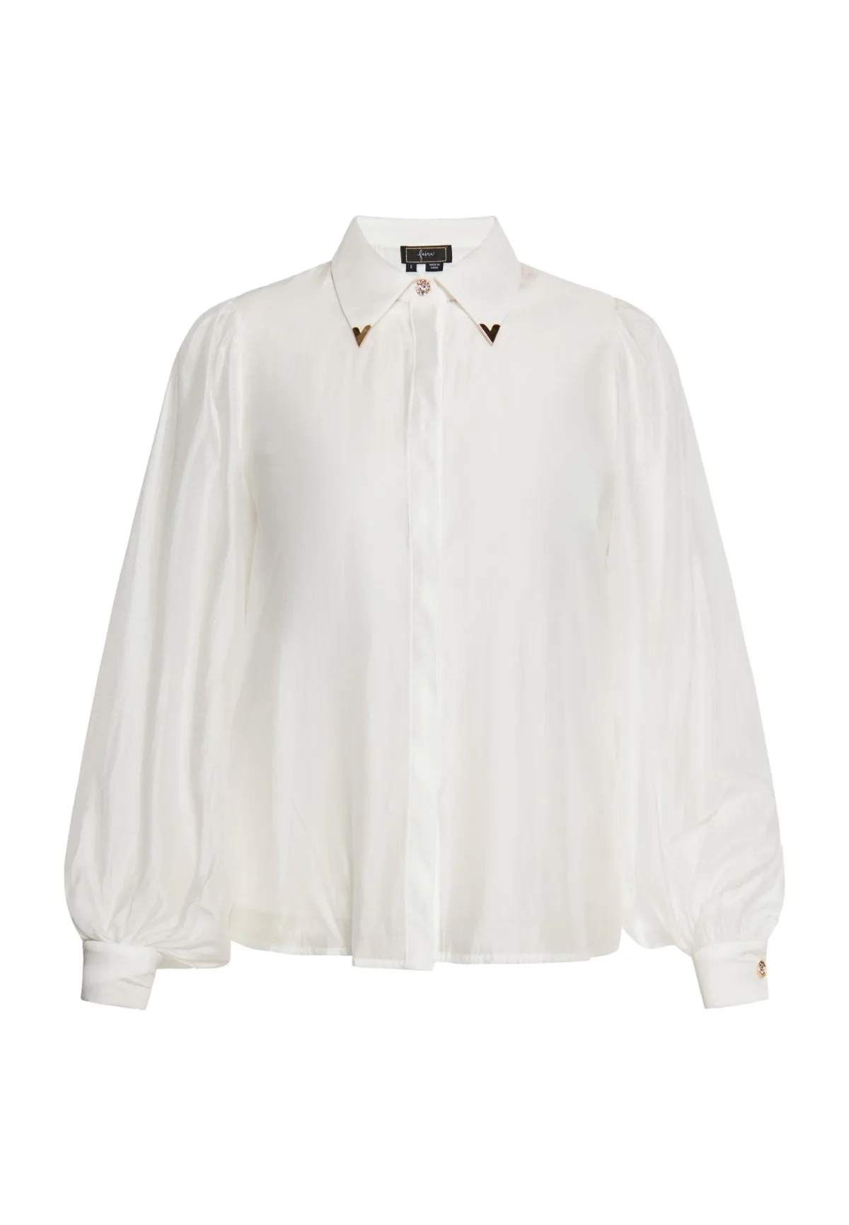 Dit licht doorzichtige overhemd van chiffon straalt elegantie en verfijning uit. Decoratieve knoop aan de bovenkant en kleine metalen versieringen op de kraag zorgen voor een vleugje charme. Lange, pofmouwen zijn afgewerkt met knoopmanchetten. De verborgen knoopsluiting aan de voorkant, de gestructureerde drapering en de relaxte pasvorm maken dit overhemd perfect voor elke gelegenheid. Dit product maakt deel uit van de elegante chiffoncollectie Overhemd